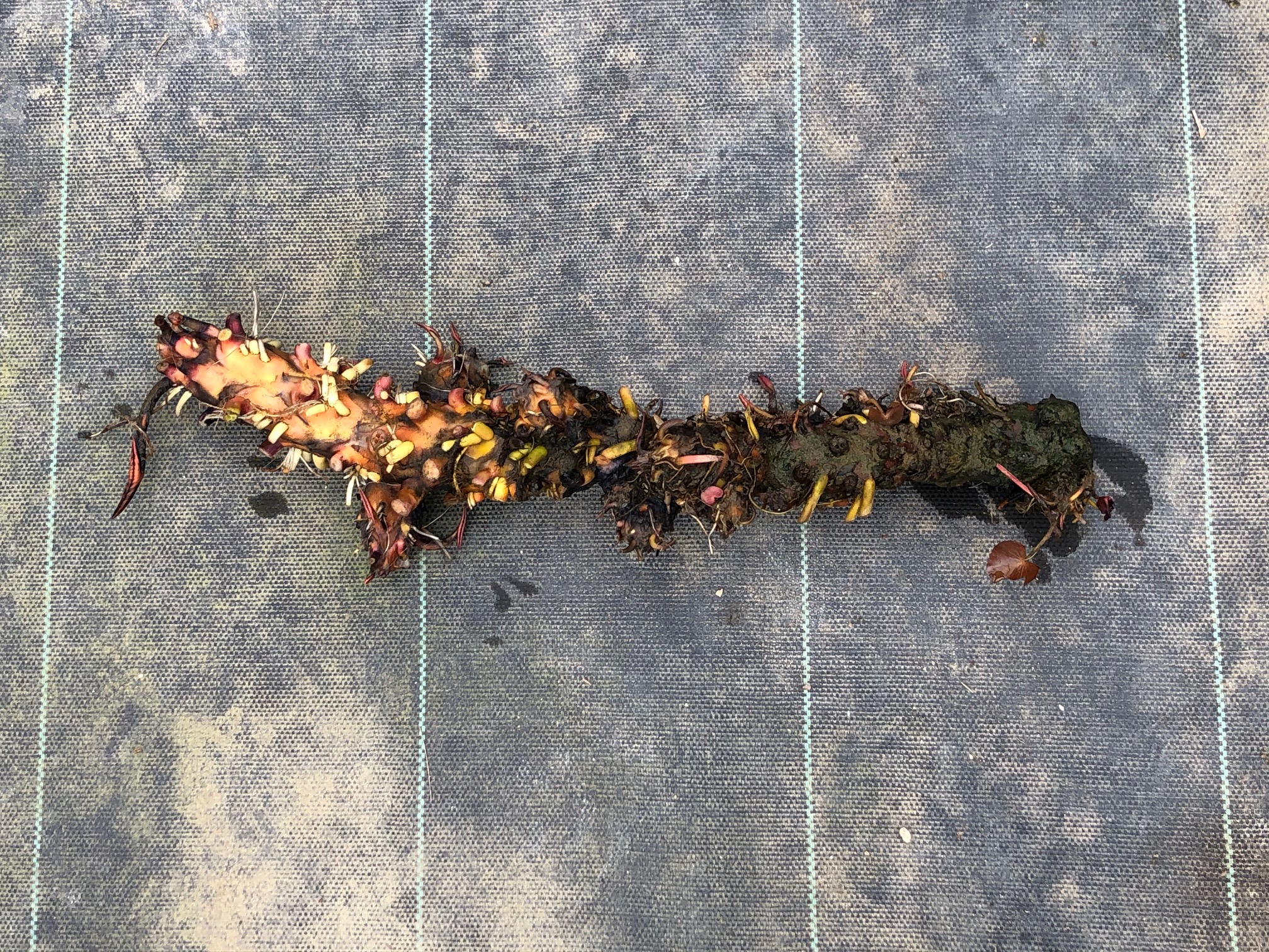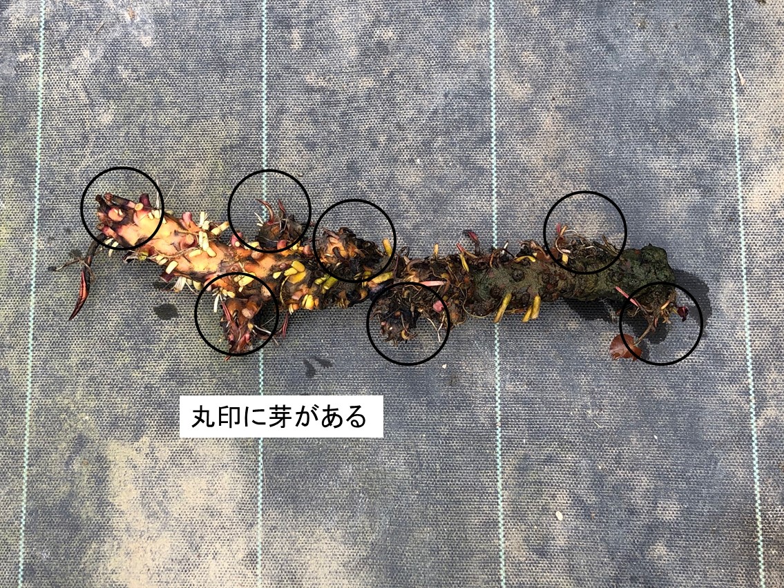 ①苗は根茎の先にひとつしっかりした芽があれば良く、横についているわき芽はカキとった方が花付きが良いです。