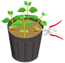タネが発芽して本葉が開いたら、生育のよい苗を1~2本選んで間引き、本葉が2枚程度開いた頃に植えつけます。庭植えが望ましいですが、できない場合は、土がたっぷり入る大型のプランターなどに植えつけましょう。