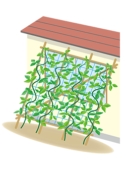 植えつけ時、あるいは本葉が5~6枚出て、つるが伸び始めるころ、目の大きさが10cm角ぐらいのつるもの用ネットと、支柱を準備します。つるは、1.5~2mぐらい伸びるので、家屋の1階やマンションの日よけに最適です。