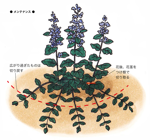 根が浅く張るので、初夏以降は高温による乾かし過ぎに注意しましょう。花後は株の消耗を防ぐために、花がらは早めに切り取ります。その後、成長が盛んになり、株元からほふく茎(ランナー)を伸ばして、子株をつくって広がっていきます。周囲の植栽に入り込んだり、植栽スペース以外まで広がったものは、その度に切って整理します。