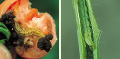- 夏に活発になる害虫で、幼虫は野菜の実の中だけでなく茎や枝の中まで旺盛に食害するため大きな被害があります。天然成分の殺虫剤「STゼンターリ顆粒水和剤」で防除します。収穫前日まで使用できます。