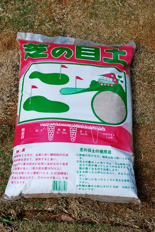 目土は芽の出る前に5㎜程度の厚さになるようにまき、トンボで全体に平らにならす。1~2年に1回行うと、表面の凸凹をなくし生育もよくなる。