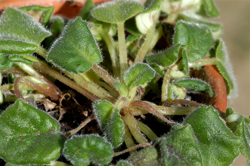 鉢土が乾きすぎると、茎の先や葉がしおれてくる
