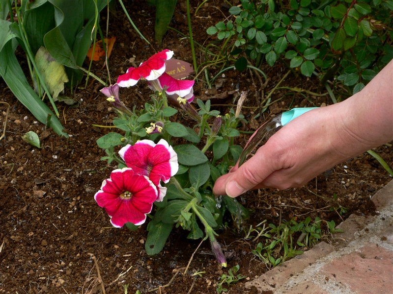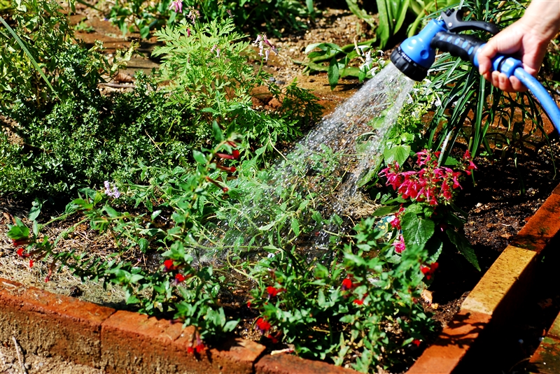 ホースに散水ノズルをつけて与えるが、水の勢いが強いと土をえぐるので、水勢の調整をする。散水ノズルは水の出方が切り替えられるものを選ぶとよい。