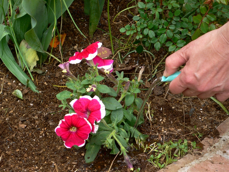 コンテナ植えの植物は、土の量が少ないので、頻繁に水やりしないと枯れてしまいます。鉢土の乾きぐあいを確かめて水やりします。