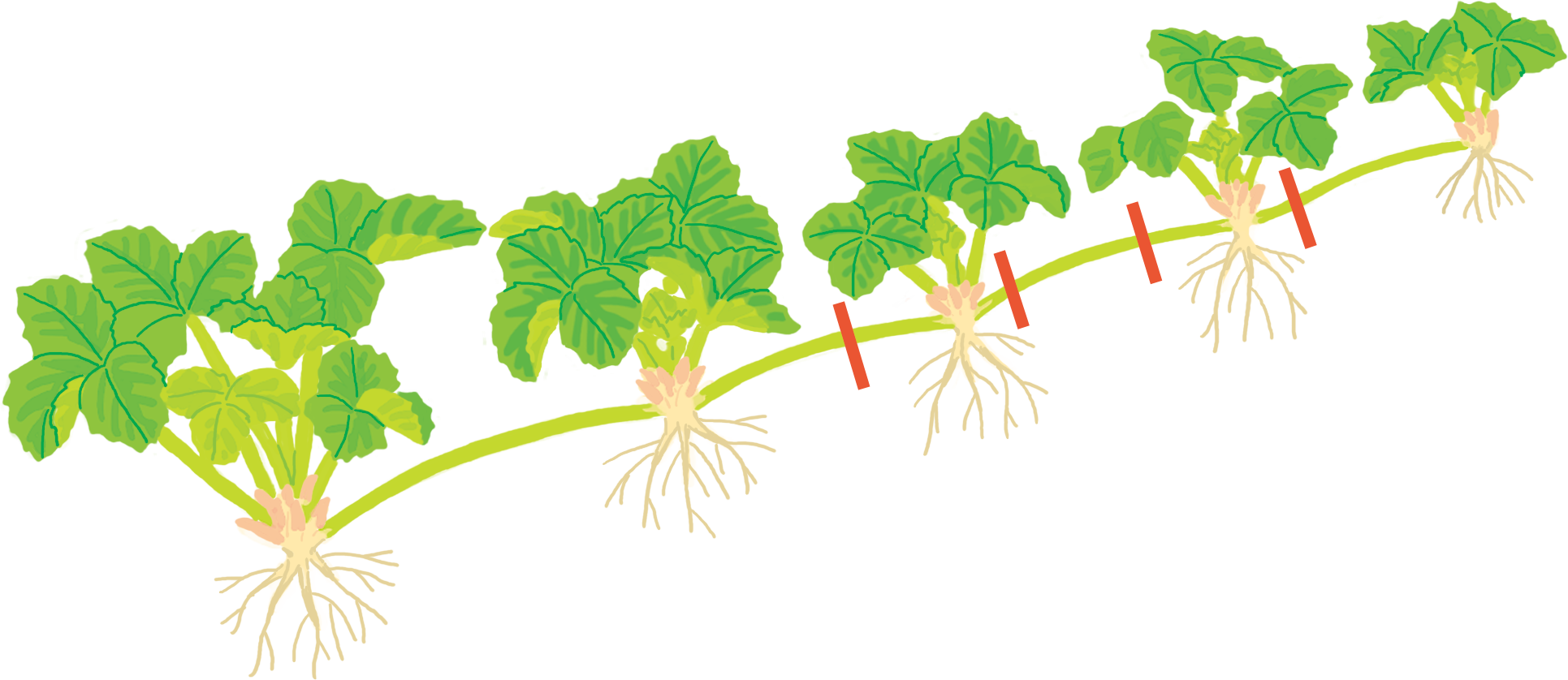 ② 根づいたら親株側のランナーを3~5㎝残して切り離し、秋の植え付けまで管理する。