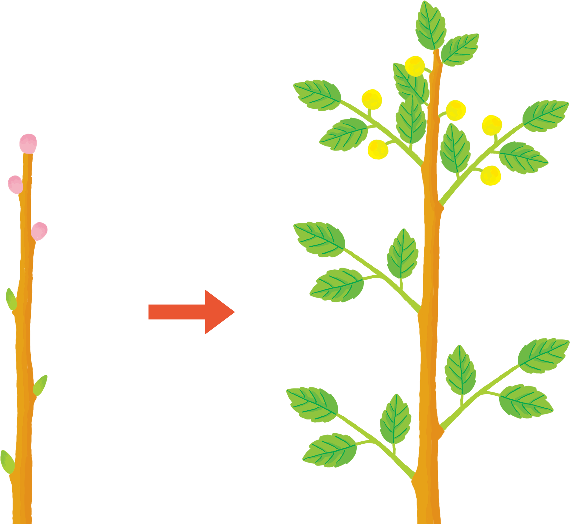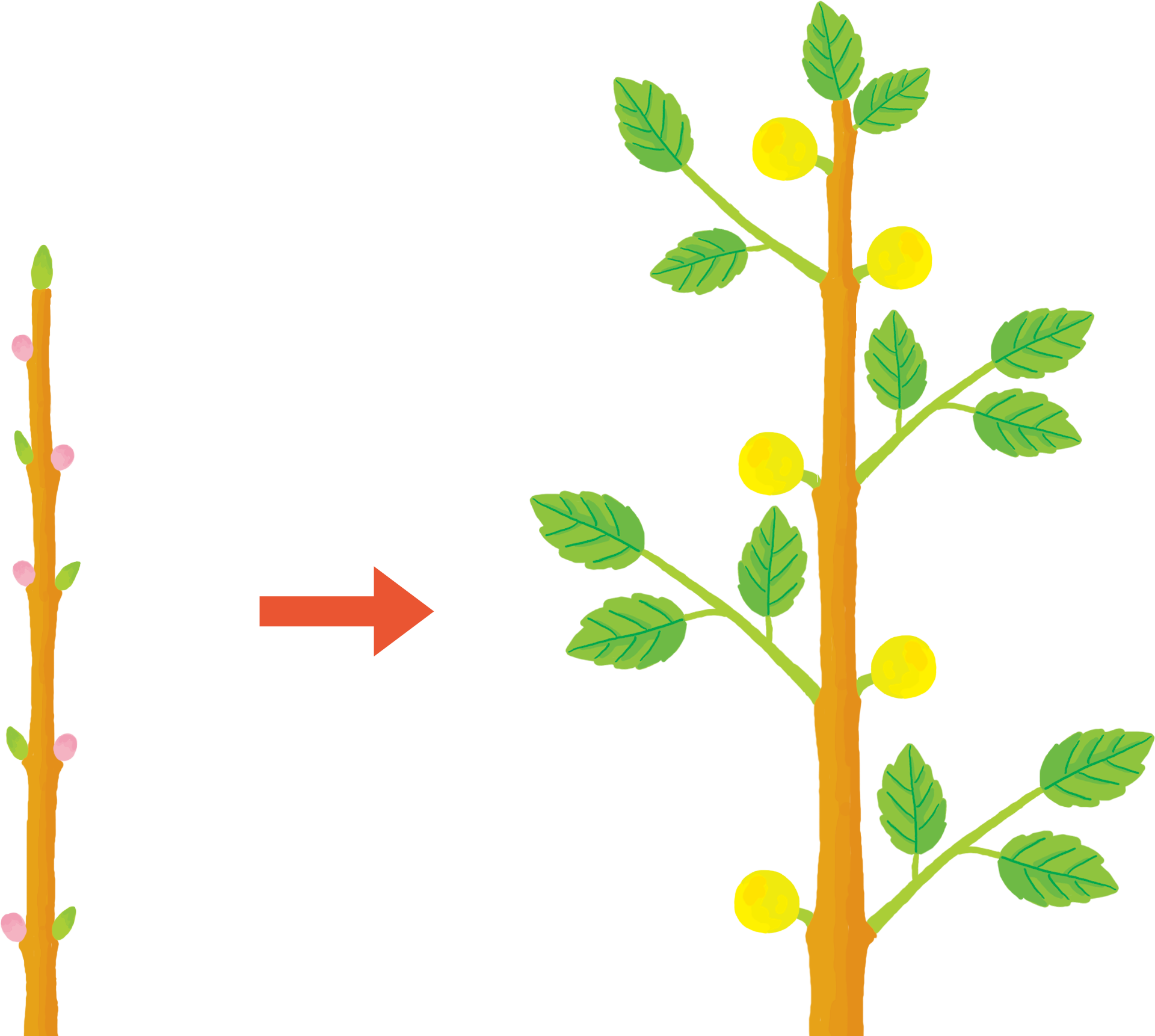 前年に伸びた枝に、花芽と葉芽がつき枝に直接実がなるグループ。冬の剪定のとき、花芽と葉芽が区別できるので、花芽を落とす心配がありません。