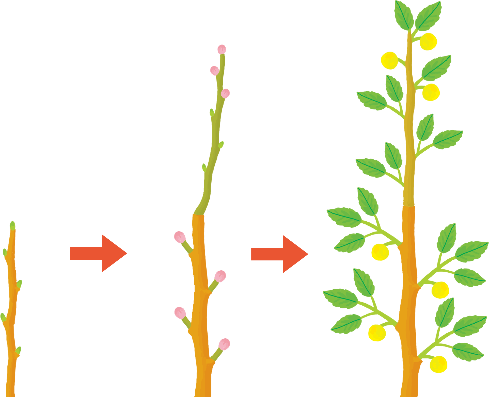 果樹に限らず植物は、若いうちは枝葉をつくることを優先するので、花つきは悪くなり、当然実もつきません。植物が成熟し、花の咲く年齢、大きさに達すれば開花、結実して子孫を残そうとするので、ほうっておいても花が咲き、実もなります。しかし、庭や鉢植えでは花の咲く年齢まで大きく育てるわけにはいきません。コンパクトな樹形をつくり、その樹形を維持して、確実に実をつけさせるには、いつ、どの部分に花芽ができ、どのような実のつき方をするか(結果習性)を知り、的確に剪定しなければなりません。