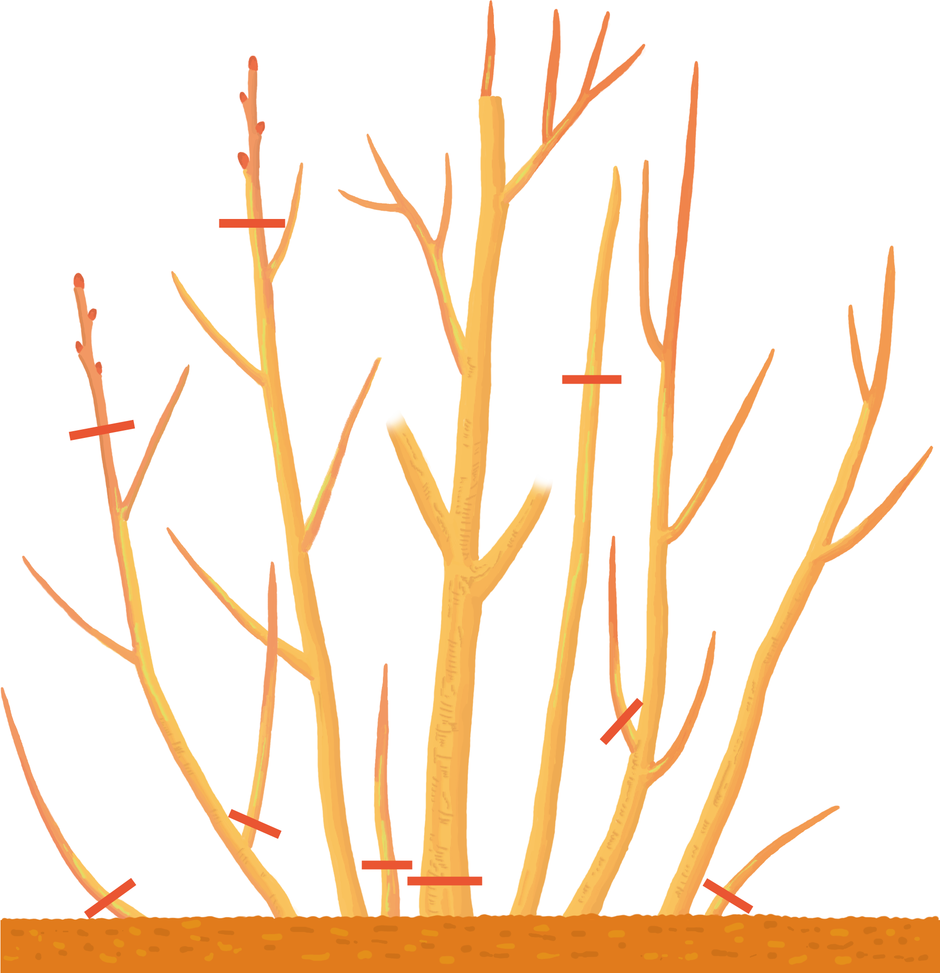 ② 弱々しいシュートや1年枝のシュート、4~5年の古い枝は株元から切り、太い枝が4~5本程度になるように仕立てる。