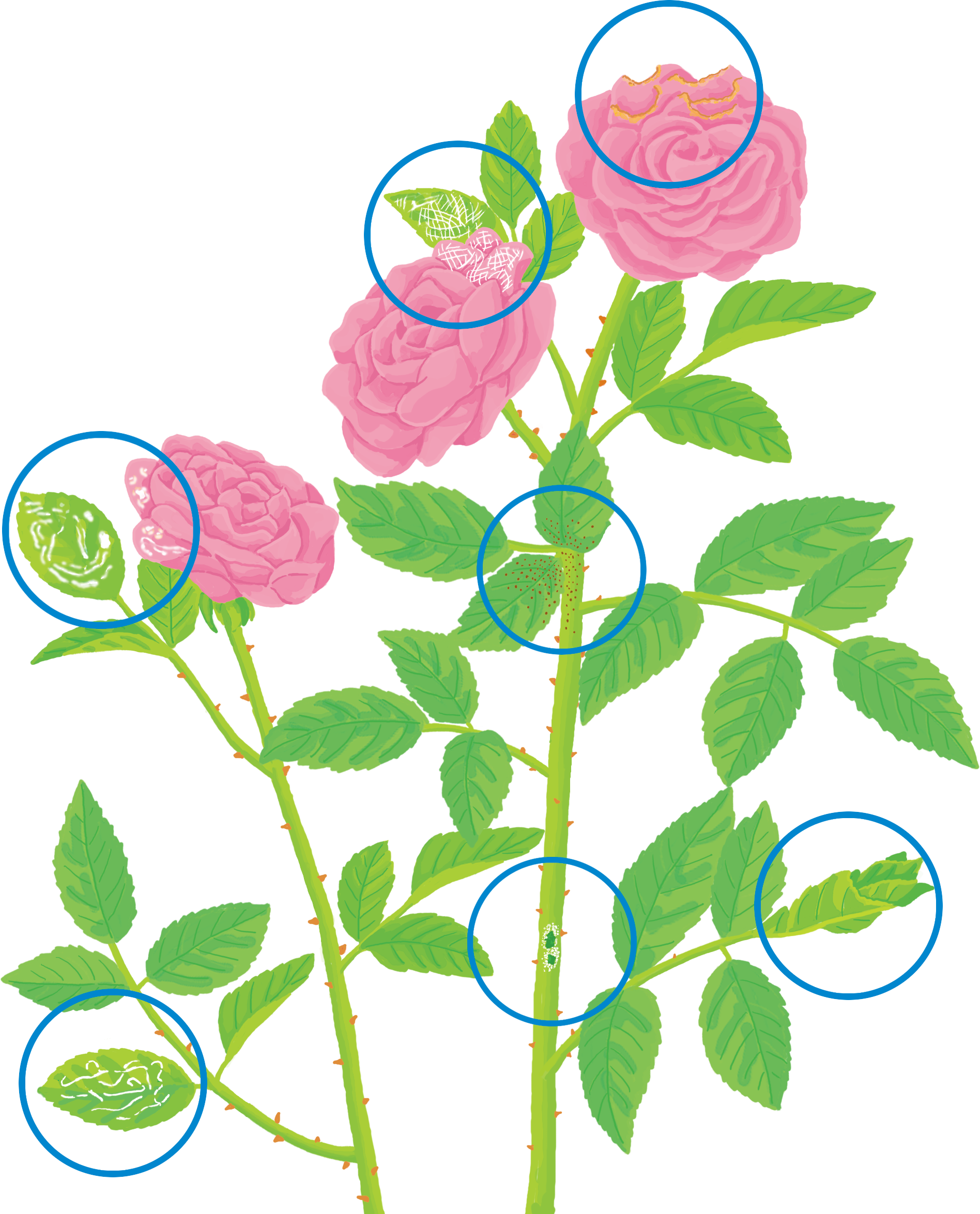 害虫は、体長が1㎜以下のものから数㎝のものまでさまざま。植物の茎や葉、花、実、根などをかじる「食害性害虫」と、葉や茎、実などから養分を吸汁する「吸汁性害虫」に大別されます。植物が丸坊主にされるまで気づかなかったりすることがないよう、こまめにチェックして、異常がないか早期に発見し、被害を最小限にとどめましょう。