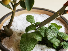 ◎ハーブがはびこり過ぎないように、葉を適宜切り取って収穫します。収穫したハーブは、お茶にしたり、スイーツの飾りに利用してみましょう。