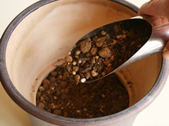 鉢穴に鉢底ネットを置いて鉢底石を敷き、Process 1 の培養土を、鉢底石が隠れるぐらいに入れます。