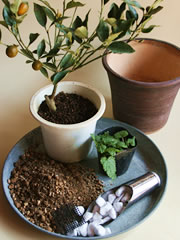 柑橘類の株(ここではキンカン'ぷちまる'を使用)、柑橘系の香りのハーブの苗(ここではレモンバームを使用)、鉢、鉢底石、鉢底ネット、培養土、化粧砂(あれば)