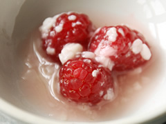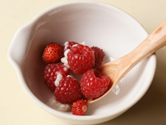 洗って水気を拭き取った果実に、市販や手づくりした塩糀を適量まぶします。塩糀は味わいや塩分が製品によってさまざまなので、ごく少量から試してみてください。今回はラズベリーとワイルドストロベリーの果実合計10粒に対し、塩糀小さじ1/2量を加えました。
