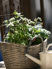 ◎ラズベリー'マイラビット'は、樹高30cmほどにしかならない矮性品種。放っておいてもブッシュ状に育ちますが、支柱やミニフェンスをバスケットにさし、ときどき枝を誘引すると、風通しがよくなります。
