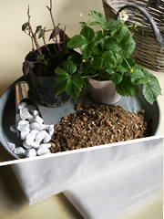 もうひとつのベリー(ここではワイルドストロベリー)をポリポットから取り出し、同様に根鉢を軽く崩してProcess 4 の横に置き、根鉢が隠れるように、Process 2 の培養土を入れます。鉢をトントンと軽く床に打ちつけ、減った分の培養土を足します。