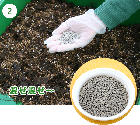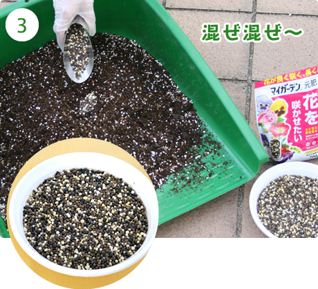 さらにノアサガオが育つ栄養、粒状肥料「マイガーデン元肥用」も混ぜ混ぜ〜。肥料の量は土1ℓ当たり8~12g!