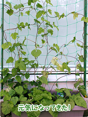 この前ネットをしつらえたら、すっかり緑のカーテンらしくなったノアサガオ。
