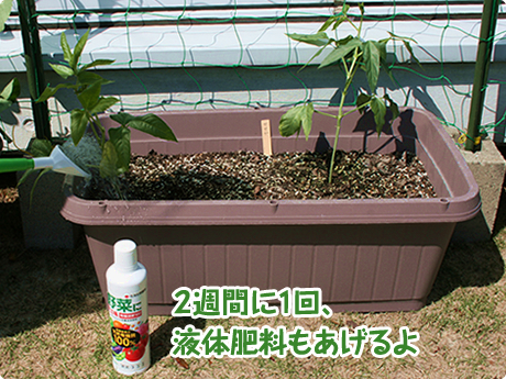 もちろんササゲにも、土が乾いたらプランターの底から流れ出てくるまで、たっぷりお水をあげて、2週間に1回、液体肥料もあげるよ。