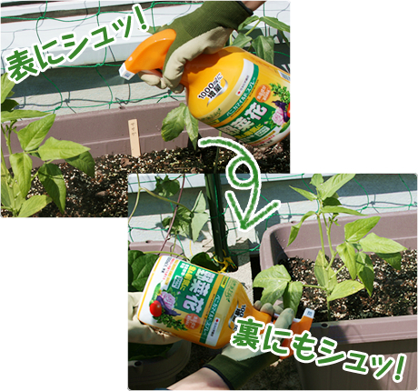 「ベニカマイルドスプレー」は逆さにしてもスプレーできるから、葉っぱの裏まで念入りに...