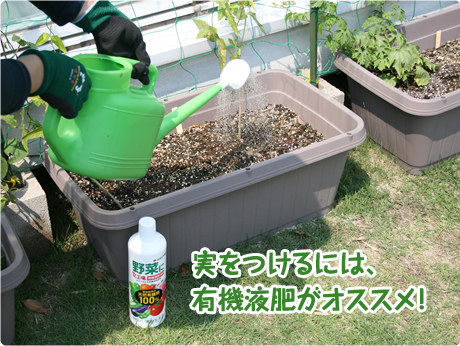 ササゲも実をつけさせるために、液体肥料「花工場有機液肥100」の100倍液がオ・ス・ス・メ!