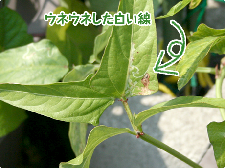 ササゲの葉っぱに、なんだかウネウネした白い線ができていたの(TへT)