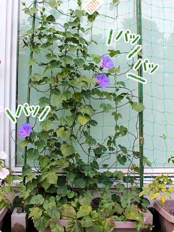 ノアサガオはふつうのアサガオと違い、午後まで咲き続けるから、寝坊してもお花が見られるよ(^▽^)/