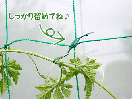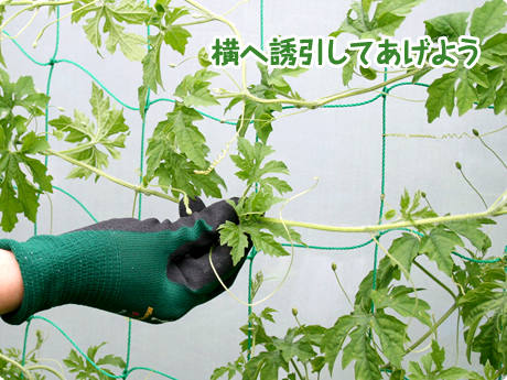 ビビッと剥がして、つるを横へ横へ誘引し直さなくっちゃ♪
