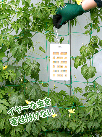 前回ノアサガオに吊るした虫よけ「無虫空間 虫よけ 吊り下げ」。緑のカーテンのお世話をしている間じゅう、イヤ~な虫が寄ってこないからとっても気楽♪ 気をよくして、ミニゴーヤーにも吊るしてみたよ♪