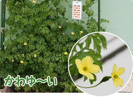 前回、かわいいお花を確認したミニゴーヤー。ゴーヤーには雄花と雌花があって、雌花のつけ根には、すでにちっちゃい実がついていることを知ったのだ♪ムフフ♪