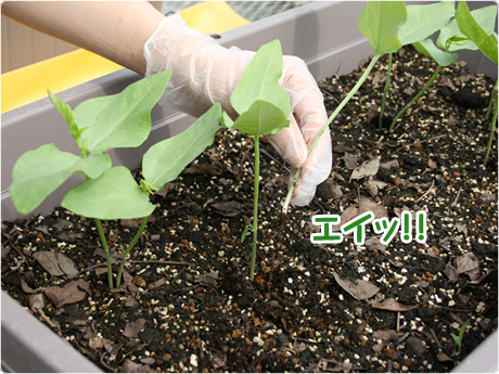 元気な芽を残して、株元をひっぱって抜く間引きを。もう手慣れたもの♪