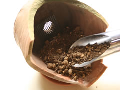 Process 1 の培養土を、鉢底石が隠れるぐらいに入れます。