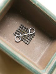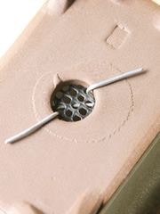鉢穴に鉢底ネットを当てて、曲げたアルミワイヤーをさします。
