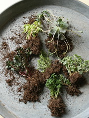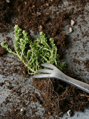 セダムの根鉢を丁寧に崩し、ひと株親指ほどの大きさに株分けしておきます。小さなフォークで根をほぐしていきましょう。