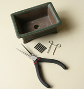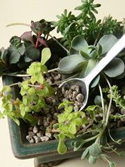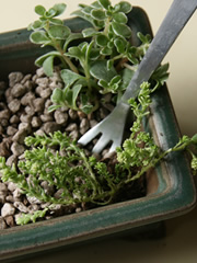 それでは好みの盆栽鉢で、おなじみの丈夫な植物を育てることからトライ。鉢がちょっと変わっただけで、植物の表情も違って見えますね。