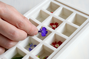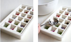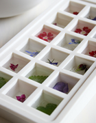 製氷皿の深さの1/3~1/2ほど、湯冷ましの水をスプーンなどで静かに注ぎます。その上に、静かに花首で切りそろえた花や葉を載せましょう。高さのある花を入れるマスは水量を少なめにし、花の高さに応じて、水の量を加減するのがポイントです。