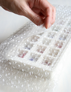 製氷皿を静かにエアパッキンで包み、冷凍庫で凍らせます。エアパッキンで包むと温度変化が穏やかになり、透明できれいな氷ができます。