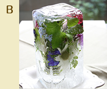 小さく束ねた花と葉を、牛乳などの紙パックに入れて凍らせた氷柱花。高さがあるので見栄えがグンとアップ。蒸し暑い夜のベッドサイドにもよさそうですね。