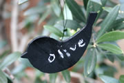 バード型にくり抜いたラベルに穴をあけ、ひもや細いワイヤーを通し、枝に下げてみました。樹木やオベリスクに絡めたつる性植物におすすめ。