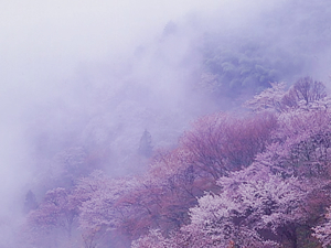 晴れた日は花見日和ですが、撮影には雨の日もまたよしです。山桜などは木によって微妙に違う花色がよくわかります。また霧雨に煙る背景は風情があり、浮かび上がる木々の姿をきちんと入れることでより遠近感が出ます。
