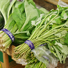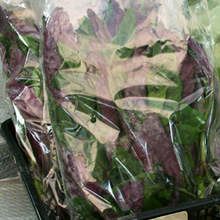 肥後(熊本)野菜の水前寺菜(すいぜんじな)、加賀(金沢)野菜の金時草(きんじそう)と同じもの。本来熱帯植物のため、沖縄では古くから栽培されており、それが熊本、金沢へ伝わったものとされています。炒めもの、和えもの、雑炊、天ぷらなどで食されます。