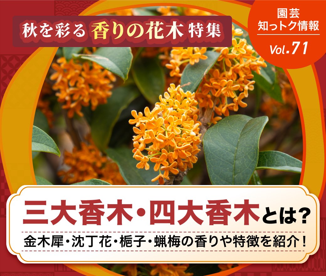 季節の移ろいを香りで知らせてくれる「三大香木」「四大香木」は、古くから多くの人に親しまれてきた香り豊かな花木です。日本の四季を彩る花木のなかでも三大香木・四大香木と呼ばれる植物は、美しい花と芳醇な香りで私たちの心を癒してくれます。