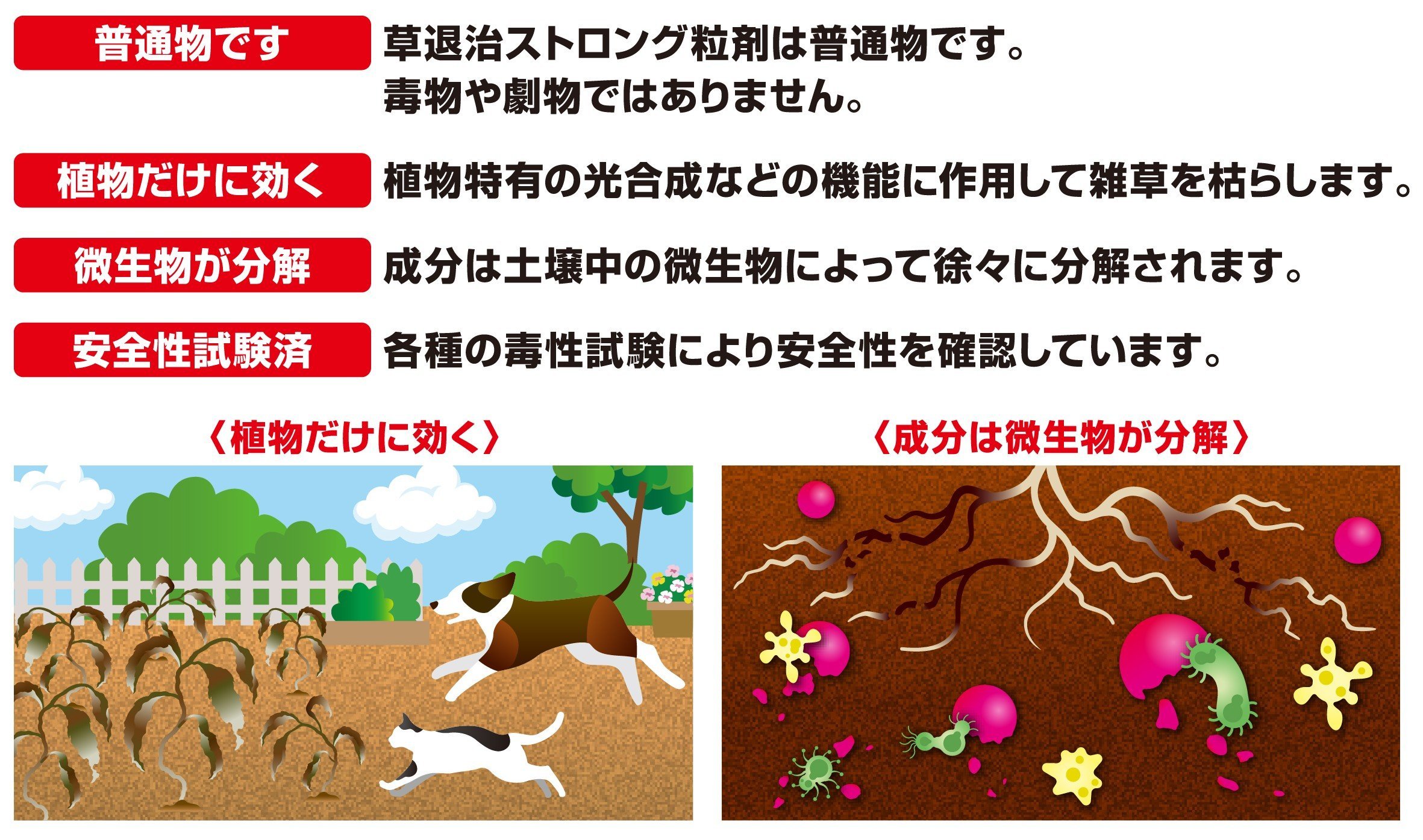 雑草は地上部を枯らしても、根が残っているとすぐにまた生えてきます。草退治STRONG シリーズは、シャワー・粒・濃縮のどのタイプでも根まで枯らし、1回の散布でも長期間効果が持続して雑草の再生を遅らせることが可能です。