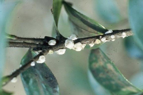 カイガラムシは、観葉植物の枝や茎、葉などに寄生する小さい虫です。体長は2~10mmほどで、貝殻のような殻があったり、ロウ状・粉状のものでおおわれたりしている虫がいたら、カイガラムシの可能性があります。