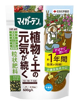 「マイガーデン粒状肥料」は、植物の生育に合わせて効く粒状の肥料です。