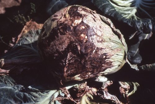 菌核病を発症すると、下葉や結球部の外側に淡い褐色水浸状の病斑ができ、徐々にキャベツ全体に広がって腐っていきます。
