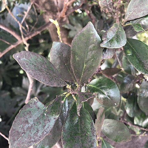 症状のある葉は、晴天が続くとパリパリに乾きますが、雨などで湿度が高い状況下ではべとべとするのが特徴です。