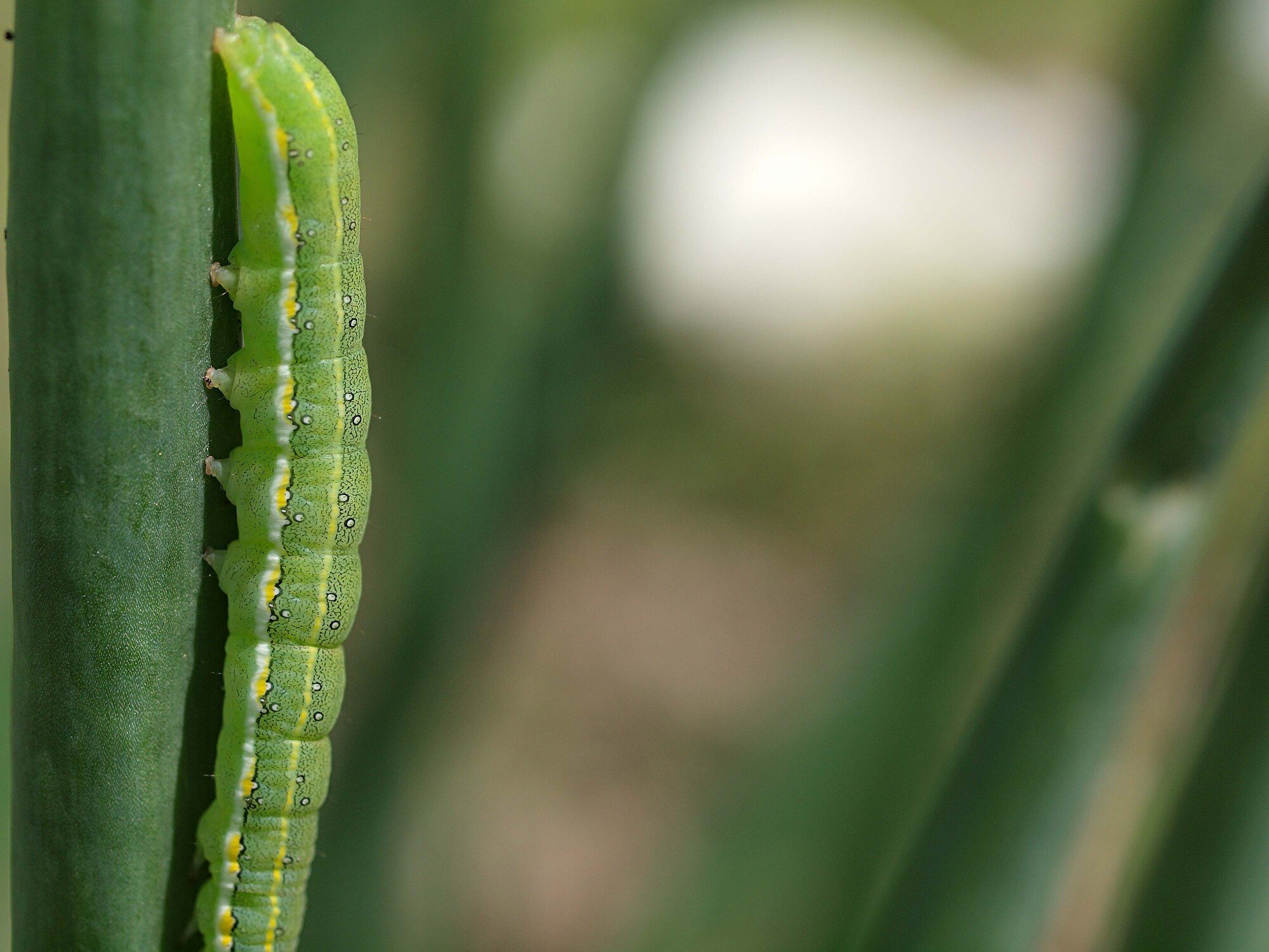 ねぎにはヨトウガ、シロイチモジヨトウ、ハスモンヨトウなど、蛾の幼虫が発生します。これらの幼虫は夜間に活動し、葉を食害する虫で、一般に「ヨトウムシ」と呼ばれます。ヨトウガは4月頃から6月頃と9月頃から10月頃、ハスモンヨトウとシロイチモジヨトウはおもに8月頃から10月頃と、発生時期が異なるのが厄介な点です。