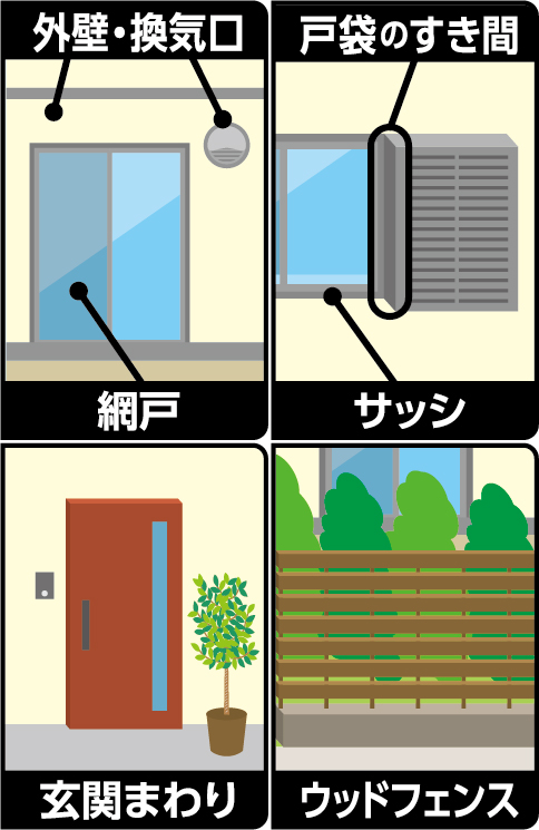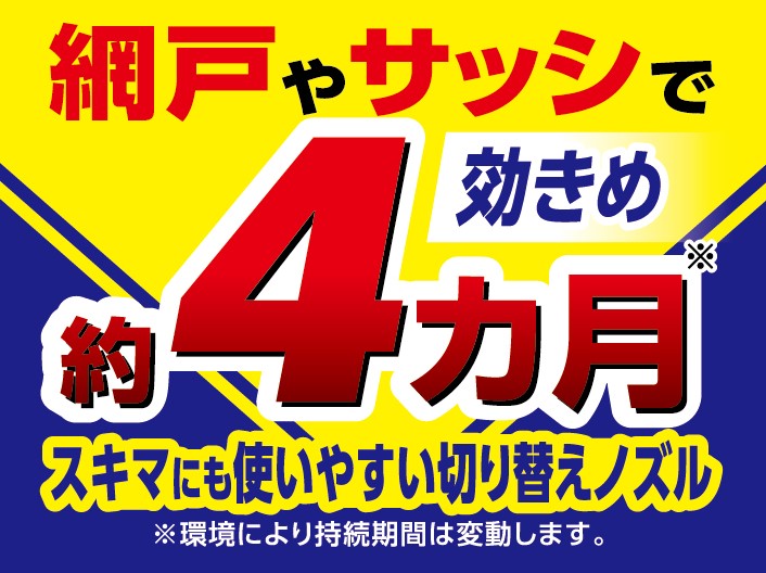 ●風向きなどを考え、噴霧が周辺の人家、通行人、ペット、観賞魚、飲食物、食器類、ペットの餌、植物、自動車等の塗装面、洗濯物、玩具、衣類、家具などの家財類などに飛散してかからないように注意してください。また水槽、池、河川などに入らないように注意してください。