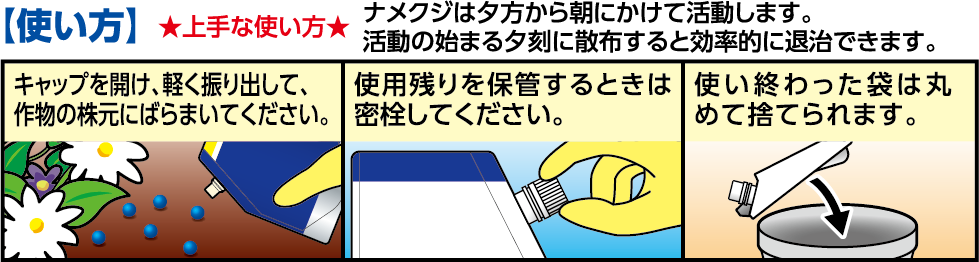 ③なるべく日中乾燥時の使用はさけ、ナメクジ、カタツムリ類が活動をはじめる夕刻に使用してください。また、雨上がりに使用すると効果的です。
